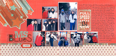 Let's just say that I have done better. Supplies: Patterned paper (My Mind's Eye-red, striped & Jenni Bowlin-stars), Die cut stars (My Mind's Eye), Alphabets/number stickers (KI Memories-"13.1", Making Memories-"Blues"), Chipboard bracket (KI Memories), Die cut alphabet (Making Memories Slice-"MS"), Pen (American Crafts), Bling (Heidi Swapp for Advantus)